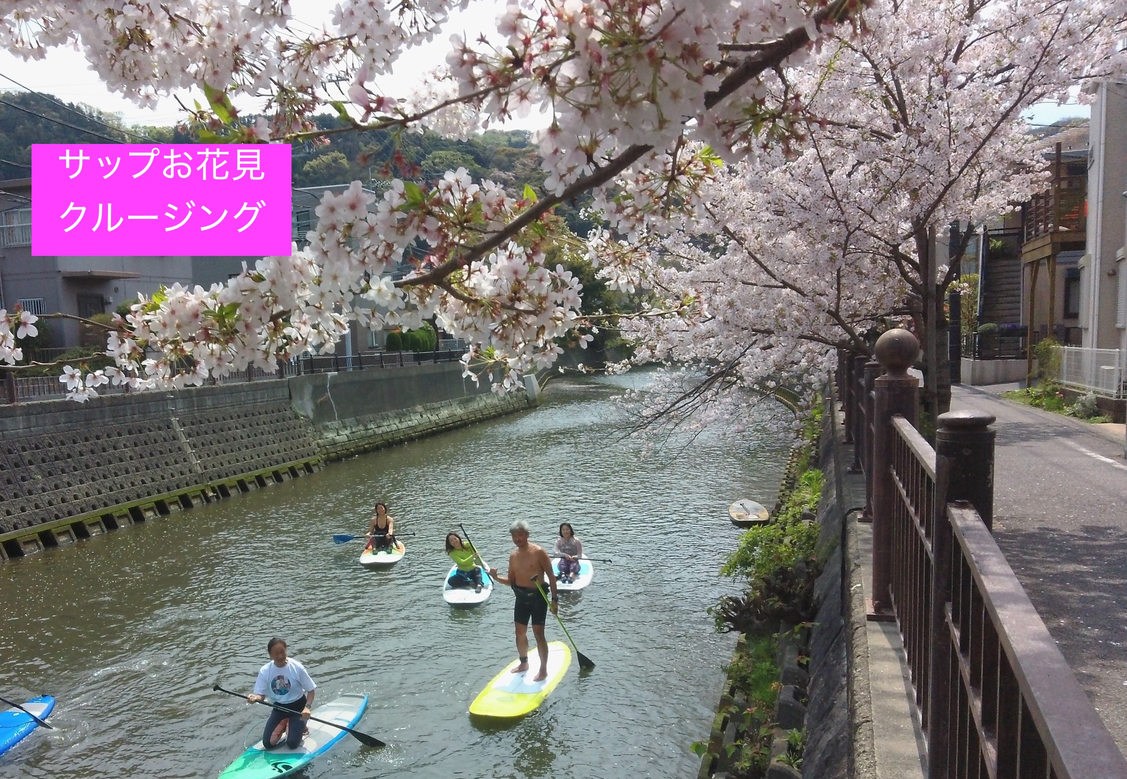 逗子の桜の名所は、逗子・葉山駅近く、田越川沿いの桜並木です。この桜のお花見にインストラクターが同行し、SUPで海から川をさかのぼり、その桜を見に行きます。川からの眺めは、陸で見るのとは一味違う美しさです。このクルージングコースは、surfersハヤマから片道30~40分くらいです。