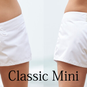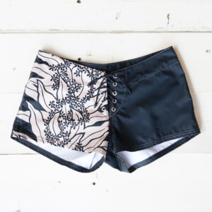 カスタムオーダーで作るsurfersオリジナルsurfトランクス。レディースのサーフトランクスは、フロント編み上げタイプの2型をご用意。裾巾細め・丈長めの「60’sナチュラルフィット」と、裾巾広め・丈短めの「60’sクラシックミニ」(モデルはクラシックミニを着用)。